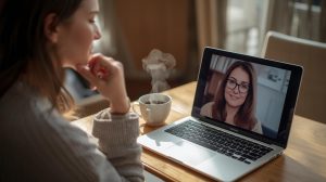 una mujer tomando teripia psicologica en linea, frente a la laptop, con un café. en la laptop la imagen de una psicologa con lentes